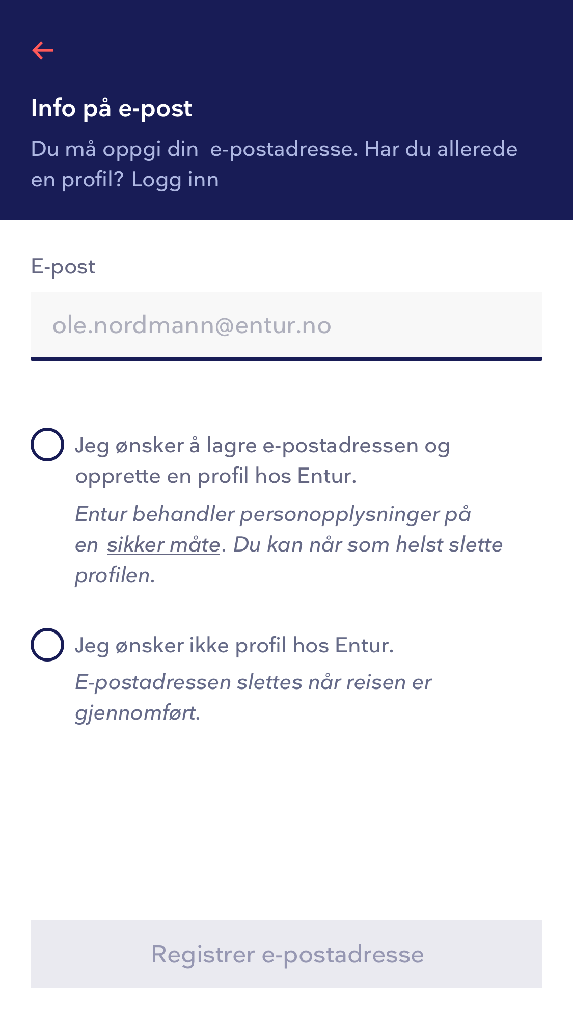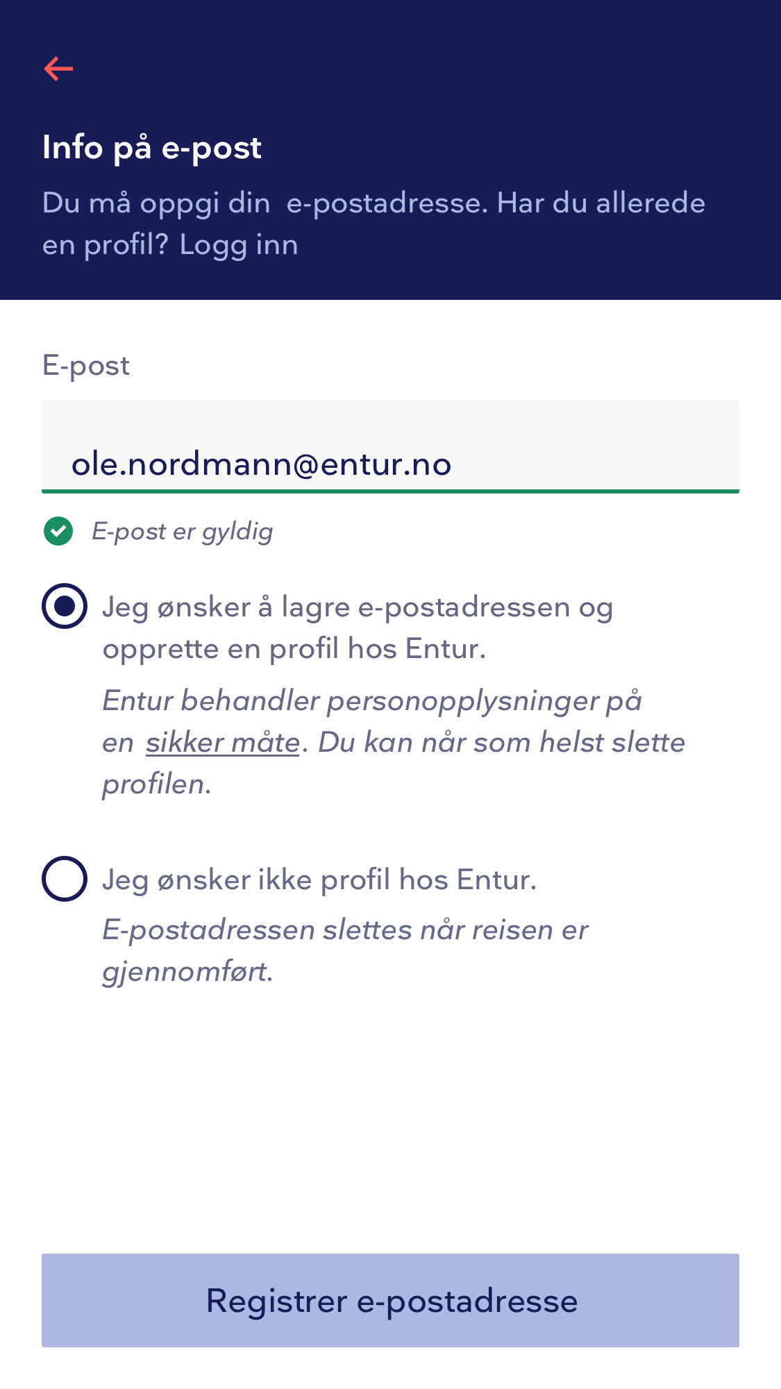 - Validering av påkrevde felter skal skje underveis i skjema, men først når man går ut av inputfeltet