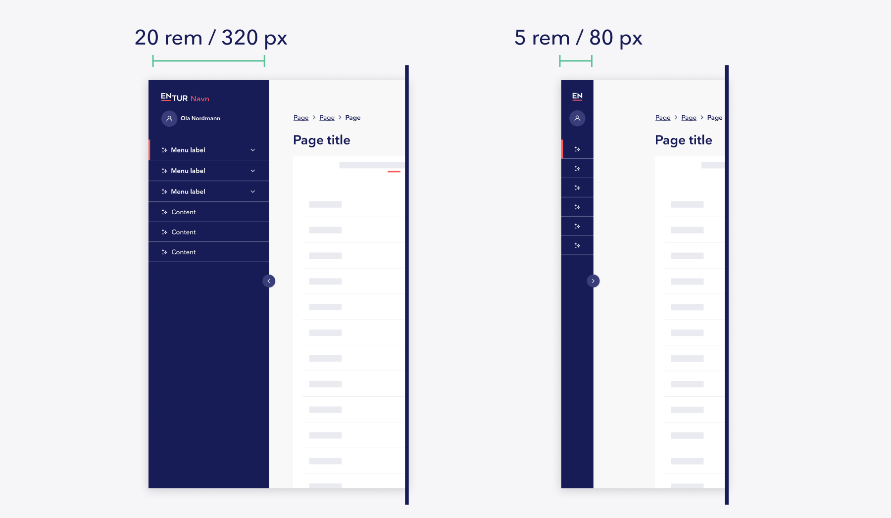 Sidebaren plasseres alltid på venstre side av skjermen og strekker seg fra toppen til bunnen av visningsområdet. Sidebaren har fast bredde og skal ikke endres per produkt. Full bredde er 320 px eller 20 rem. I kollapset tilstand er bredden 80 px eller 5 rem. Les mer om rem.