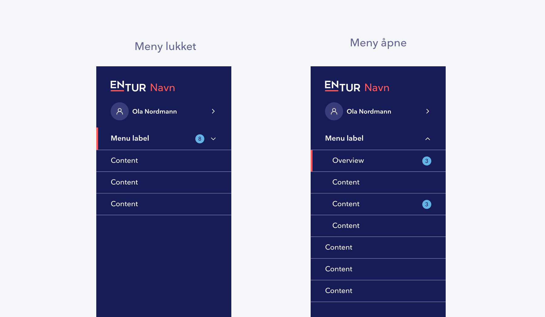 Vi anbefaler å bruke ikoner kun på første nivå i sidebaren. Undersider bør vises uten ikon for å holde hierarkiet tydelig og gjøre navigasjonen raskere å skanne, siden kun hovedkategorier får ikon.
