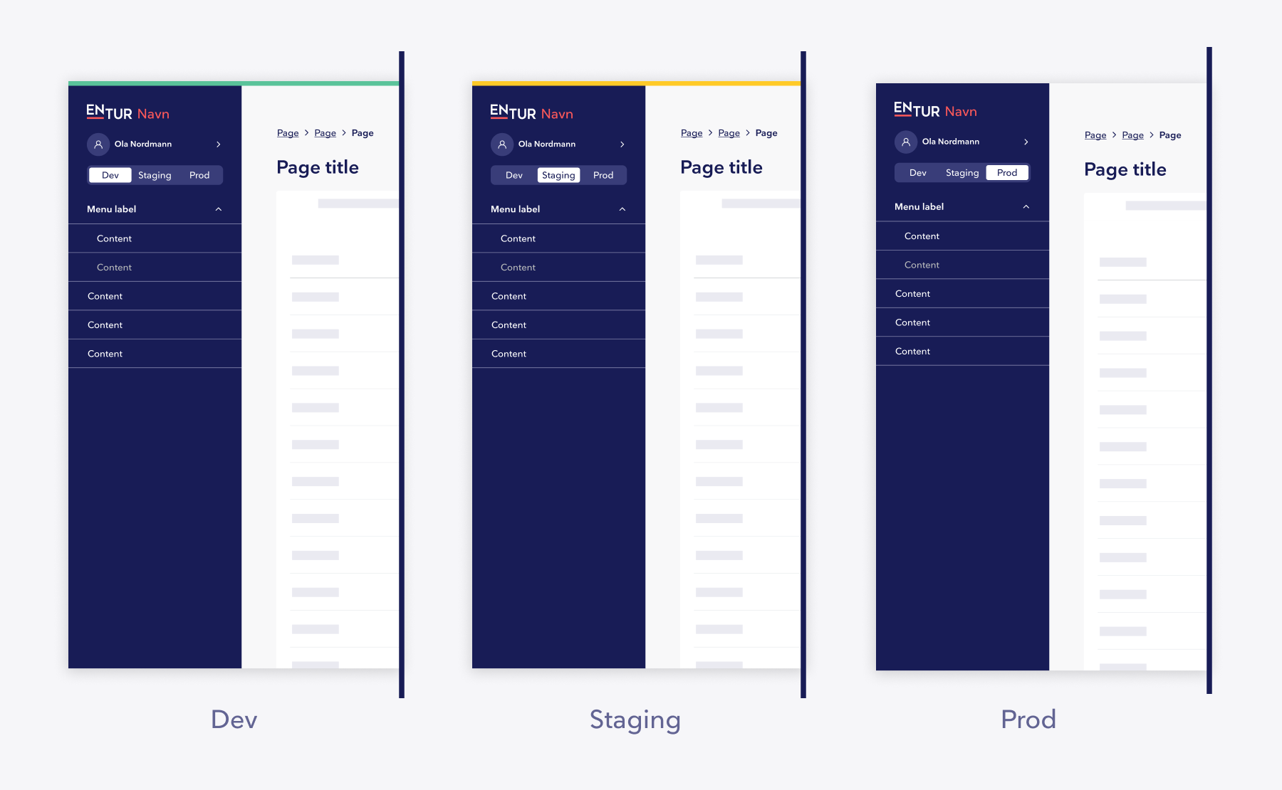 Når miljøvelgeren er tilgjengelig, skal aktivt miljø være tydelig markert. I dev og staging vises en fargestripe øverst i applikasjonen, der dev markeres med mint-40 og staging med canary-60. I produksjon (prod) vises ingen fargestripe.
