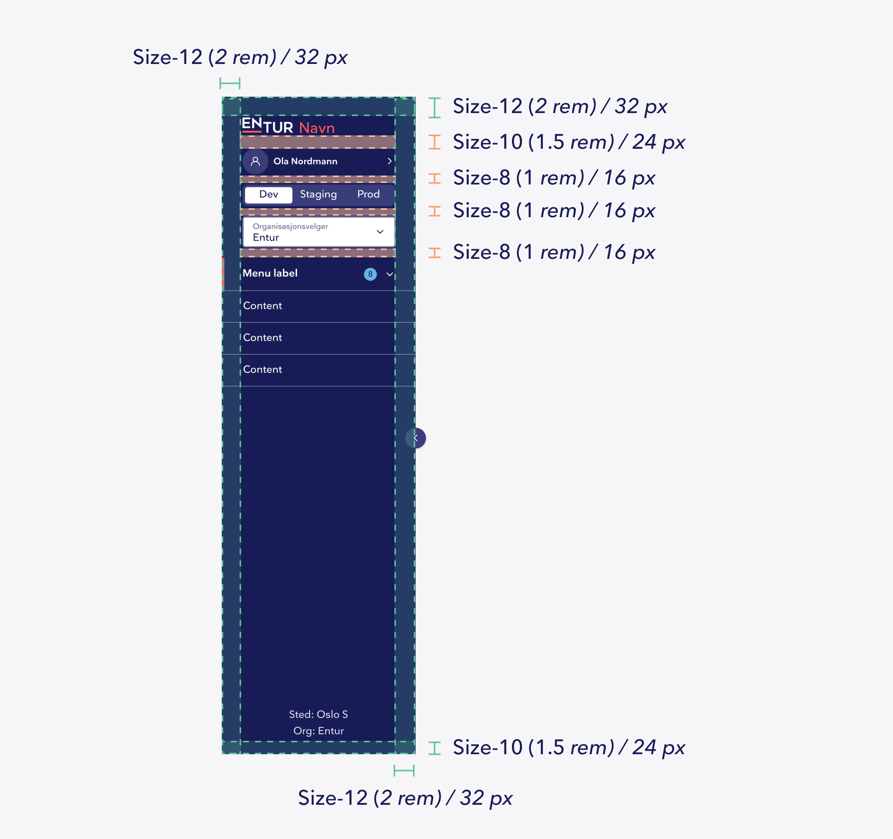 Følgende spacing definerer standardoppsettet for sidebar. Komponenter som ikke er tilgjengelige i produktet fjernes, uten å endre øvrige avstander.