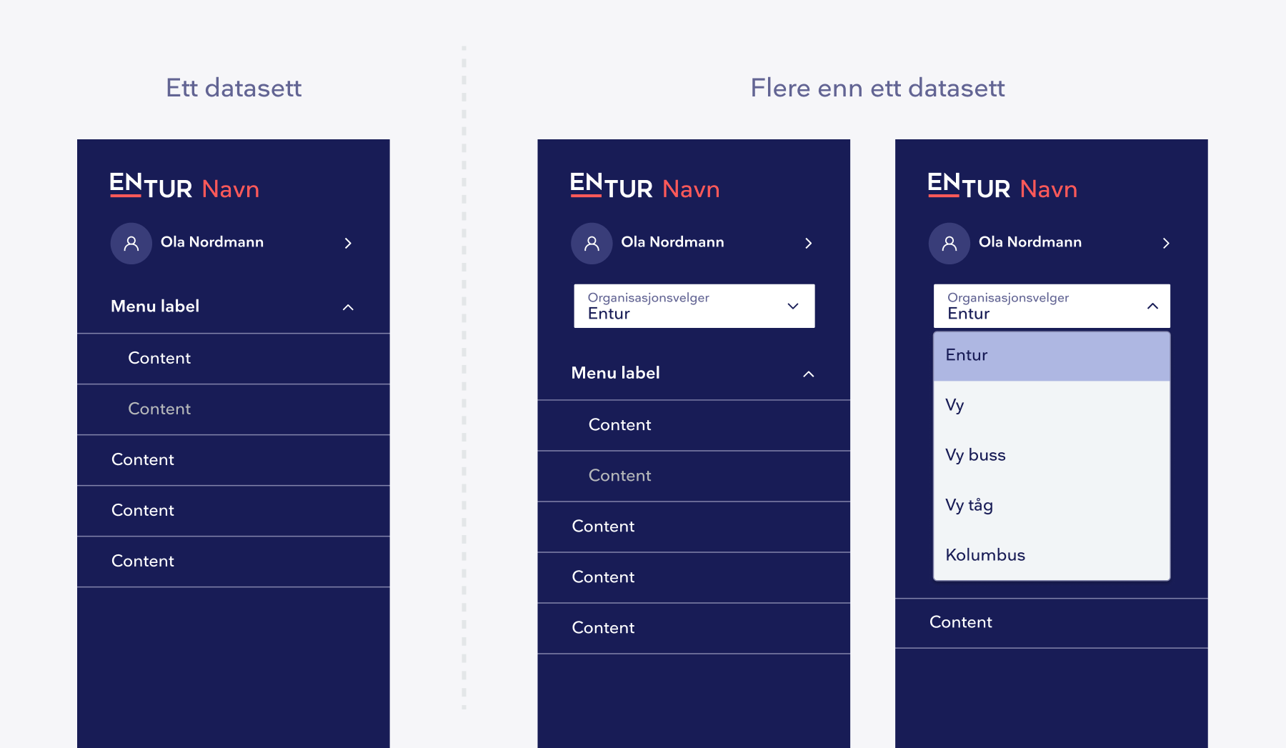 Når brukeren har tilgang til flere datasett, skal det aktive datasettet være tydelig synlig. Dersom kun ett datasett er tilgjengelig, skal datasettvelgeren ikke vises.