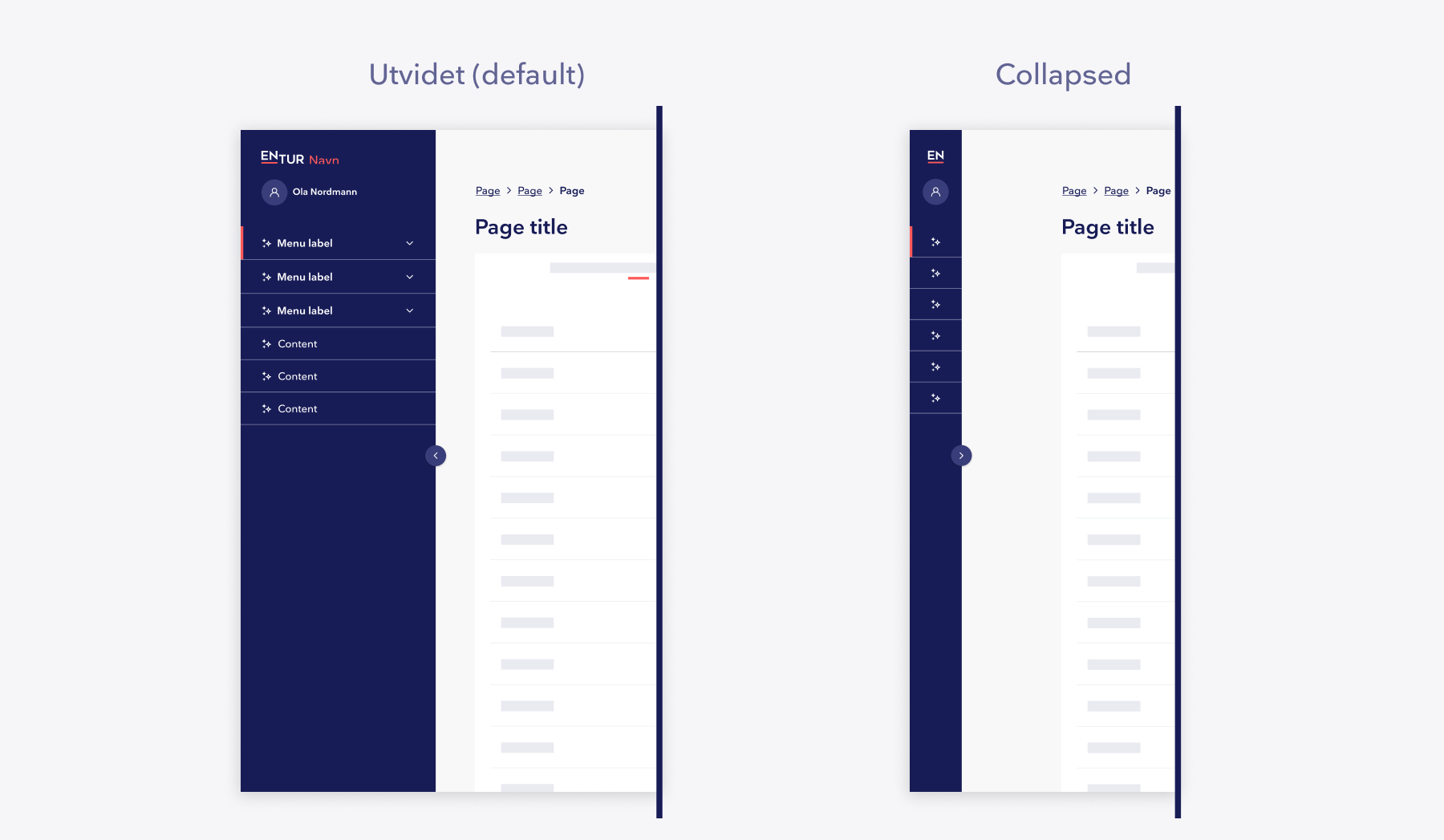 Når sidebaren er kollapset, vises den i ikon-visning. Produktlogo vises som forkortet logo, og brukerindikator vises kun som ikon. Navigasjonselementer vises uten tekst.