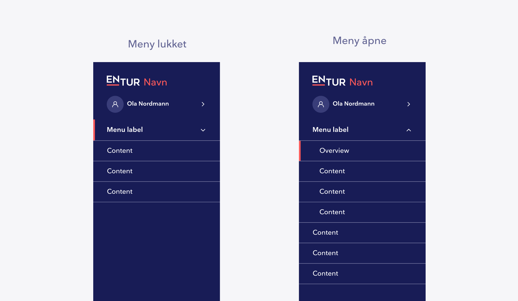 Når en underside er aktiv og det overordnede elementet er utvidet, vises aktiv tilstand på undersiden. Når det overordnede elementet er lukket, vises aktiv tilstand på dette for å vise at en side i gruppen er aktiv.