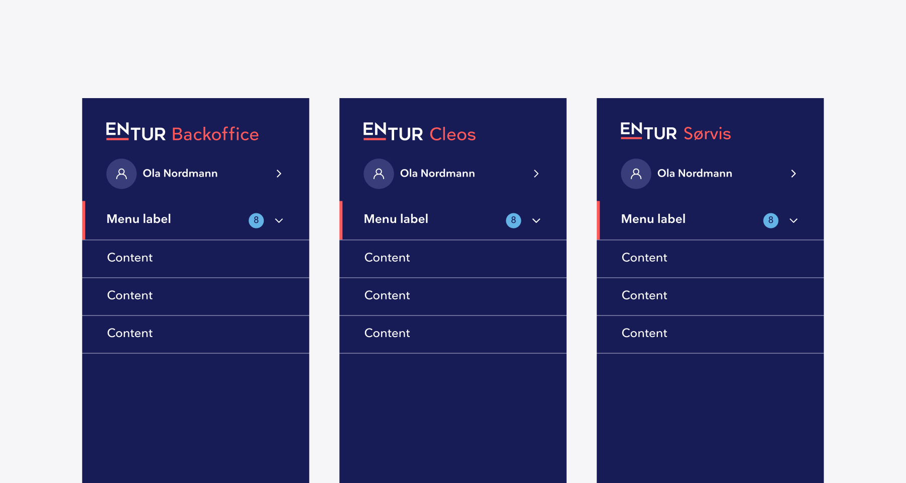 Logoen i sidebaren skal være 24 px høy og bestå av «ENTUR» etterfulgt av produktnavn. «ENTUR» skrives med store bokstaver, og produktnavn starter med stor bokstav. Ingen annen tekst skal inngå i logoen.