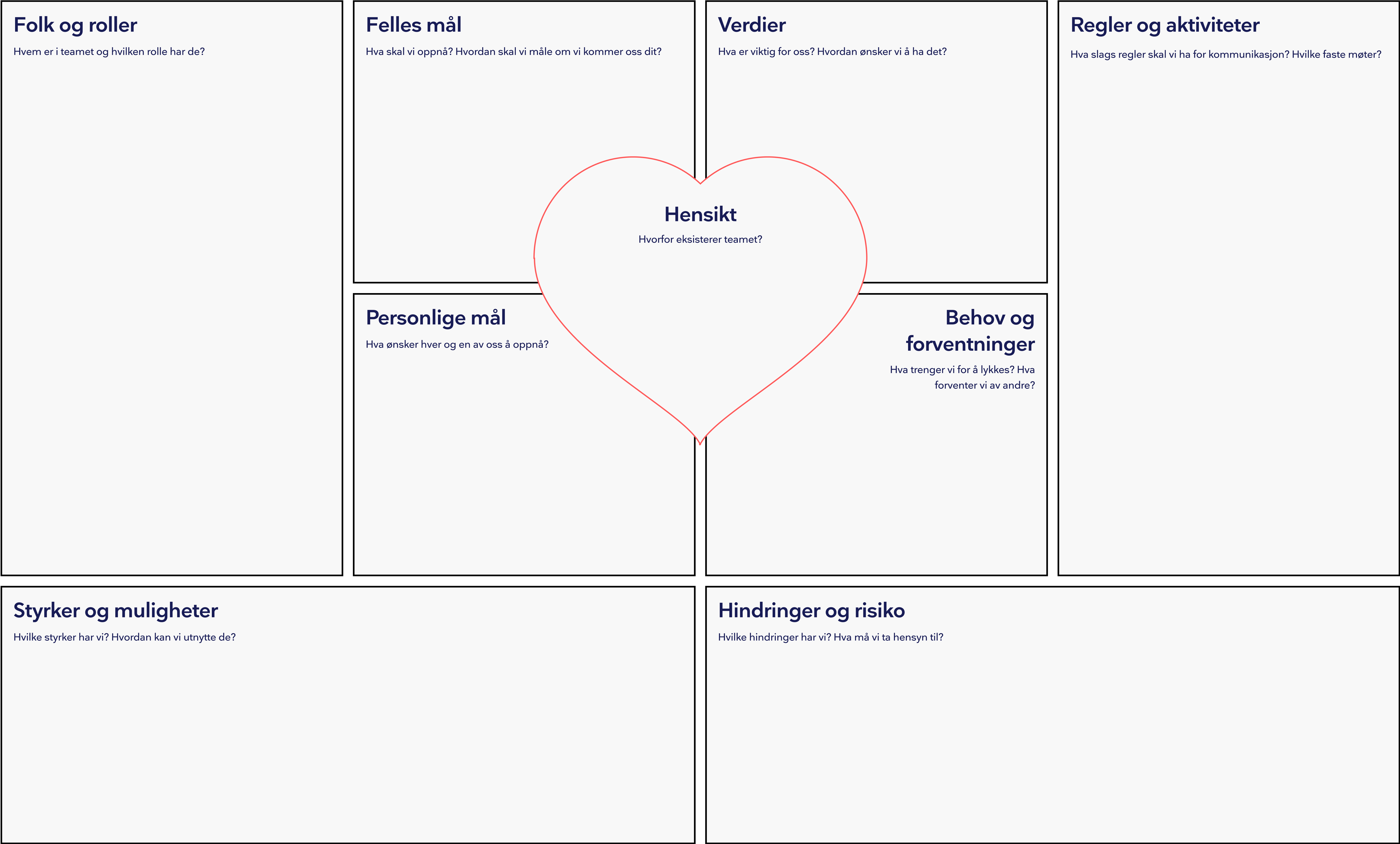 Gjennom å jobbe med Team Canvas legger teamet grunnlaget for åpenhet, sosial trygghet og tydelige spilleregler. Det gjør det enklere å finne en felles retning og skape et godt samarbeid i hverdagen.